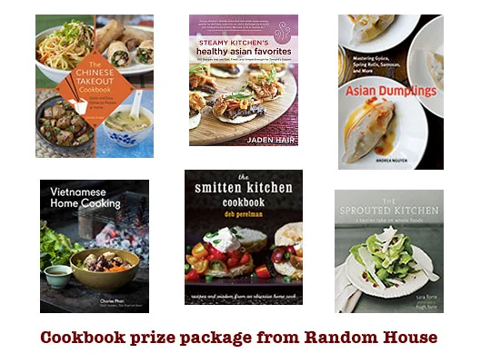 - A cookbook set of 6 wonderful new releases and older favorites, from my friends at Random House: The Smitten Kitchen Cookbook, Steamy Kitchen's Healthy Asian Favorites, The Sprouted Kitchen: A Tastier Take on Whole Foods, Vietnamese Home Cooking, Asian Dumplings, and another copy of The Chinese Takeout Cookbook to keep or give away.