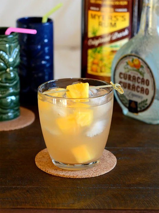 - Fill a shaker with ice. Add the rum, lime juice, Orange Curaçao, orgeat, and simple syrup. Shake well and strain into a glass over ice. Garnish with a pineapple wedge(s) or umbrella.